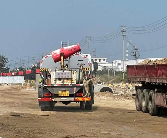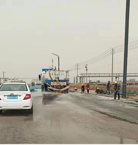 近日,在江苏海建徐圩港区242省道连接线工程(港前大道至228国道段)道路出新项目现场,洒水车、雾炮车等正在来回作业,控制扬尘。