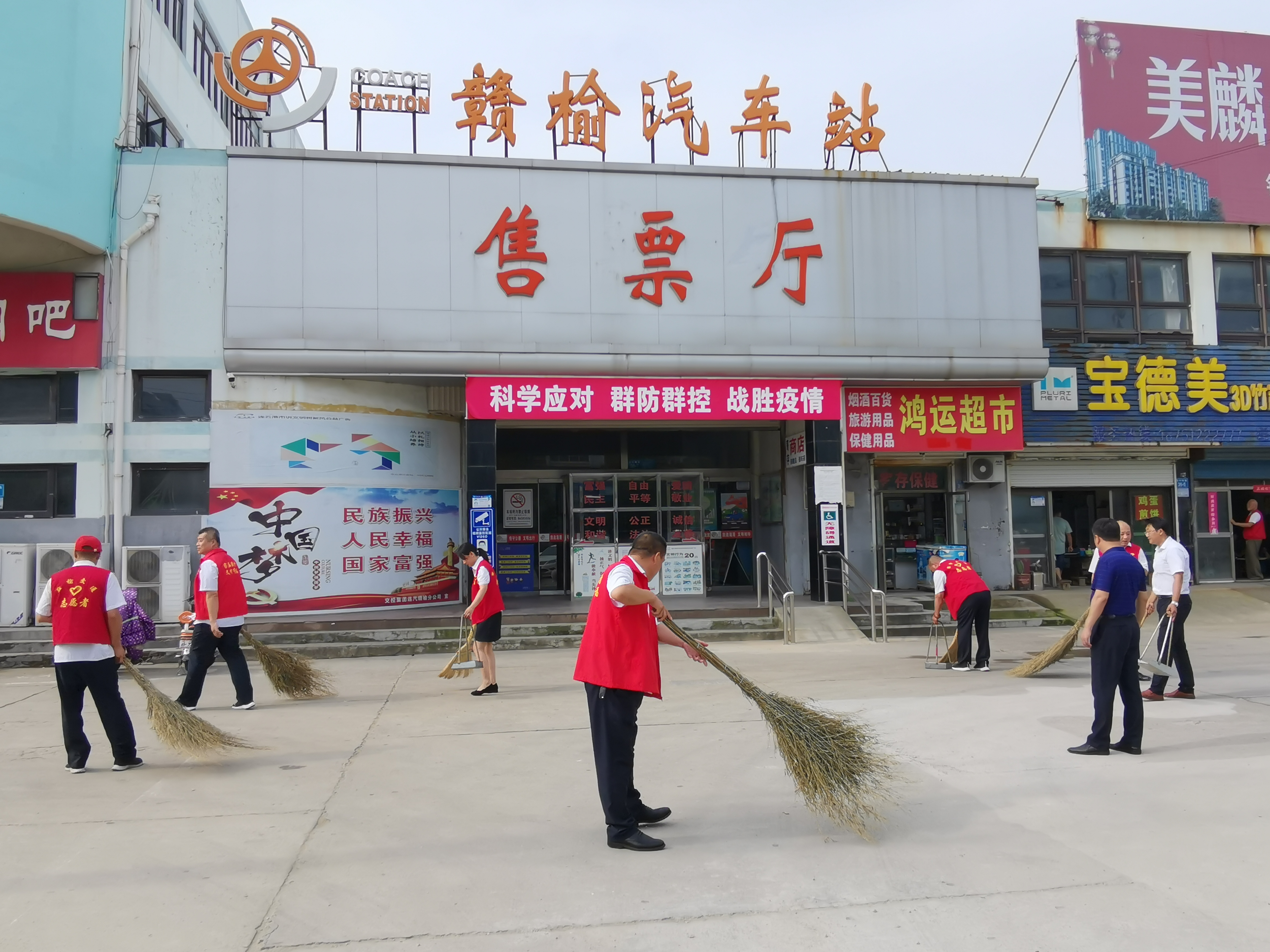7月8日早上8:00,赣榆公司组织志愿者们身穿红马甲,拿着扫把等各种工具对站前北广场、出租房门前等地进行卫生大扫除活动,对门前的烟头和小广告进行进一步清理,将一辆辆乱停乱放的共享单车有序摆放到指定的区域内。