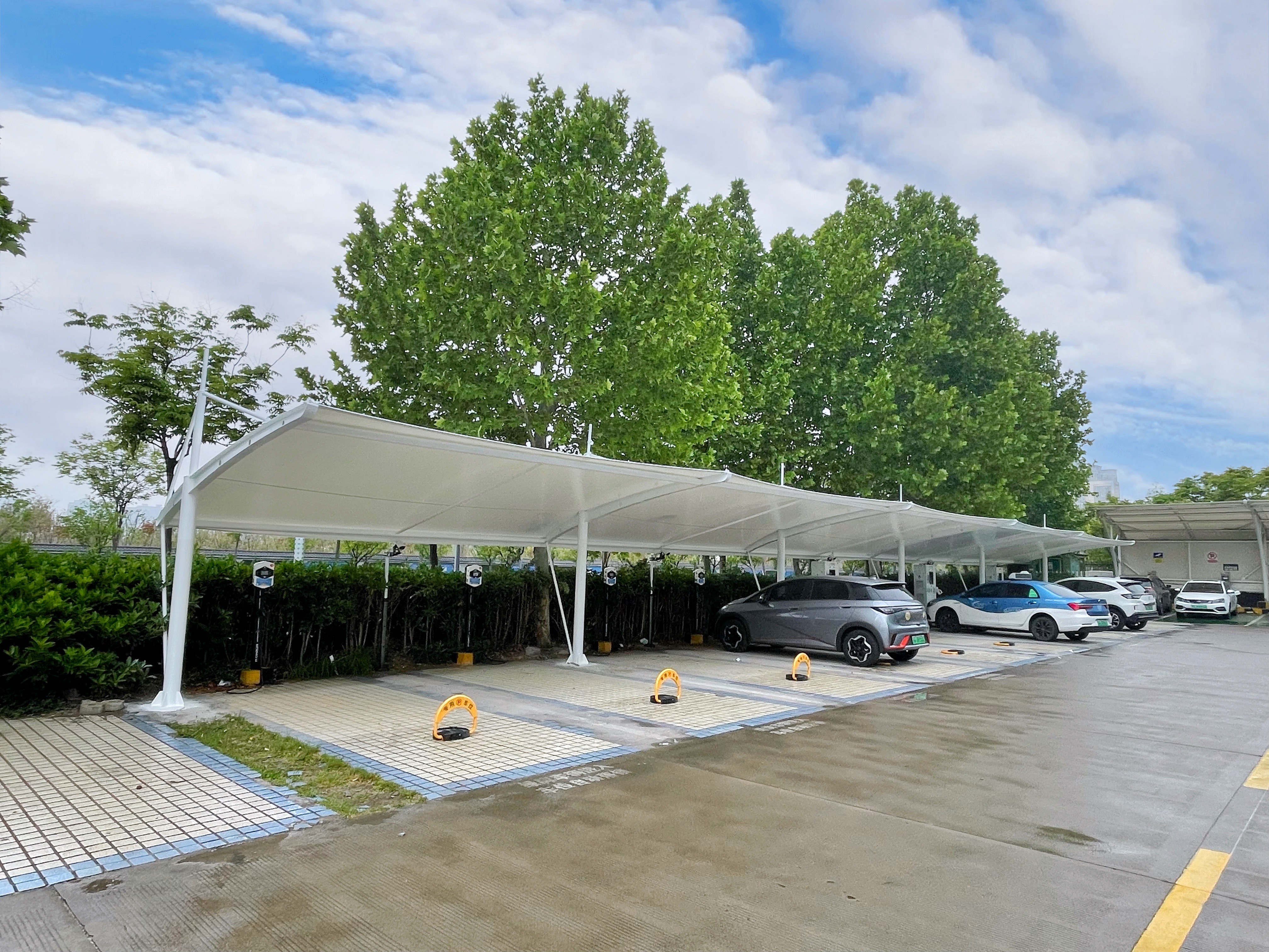 该项目位于市区信访局、老干部局充电站,此次车棚建设改造是为了改善充电站整体形象和服务舒适性,膜结构停车棚虽然结构简单、外观新颖,但其制作安装过程中所用材料质量、施工工艺、膜布张拉及承受自然界强风、暴雨、暴雪等荷载冲击上有严格的强度要求,再加施工节点多、受力变化复杂的特点,根据充电站停车区域分布状况,结合景观设计布局,编制效果方案,最终确定了停车棚外观样式按拉杆式膜结构建设。停车棚的投入使用,为即将到来的夏季天气燥热、温度高、以及雨水天气用户在使用车辆停放充电需求时提供更好的便利。