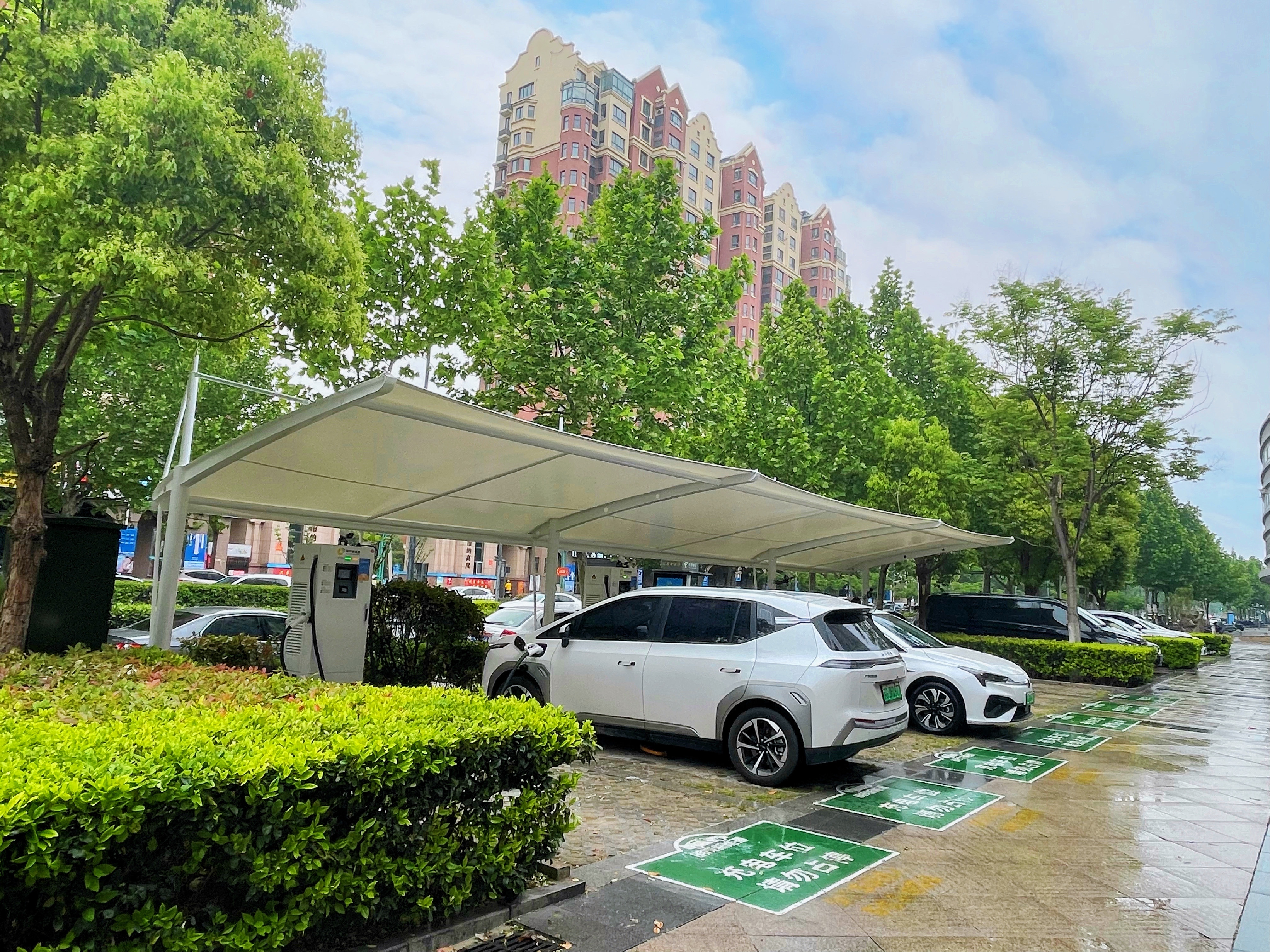 此次膜结构车棚建设可以有效减缓日照强度,减少日照时间,即使在炎热的夏季,停放的汽车也能够受到很好的保护,对于新能源车主充电而言更加舒适便捷。同时,为做好节假日期间安全生产工作,明茂公司智慧充电事业部筹备组也对现场及操作施工区的消防、用电、临边防护等进行全面巡查,确保施工安全。