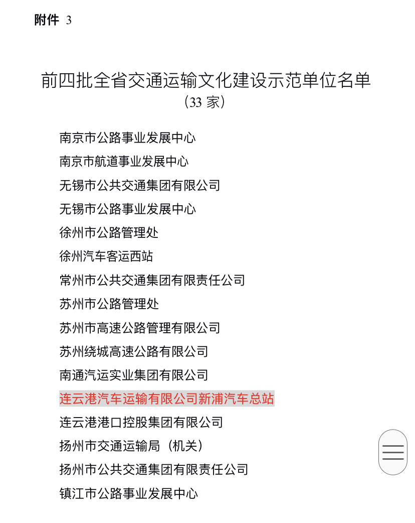 近日,省交通运输厅开展第五批全省交通运输文化建设示范单位申报评选及复核认定工作。新浦汽车总站作为连续四年江苏省运输文化建设示范单位荣誉获得者,将继续发挥示范引领作用,在文化建设实践中再创佳绩。