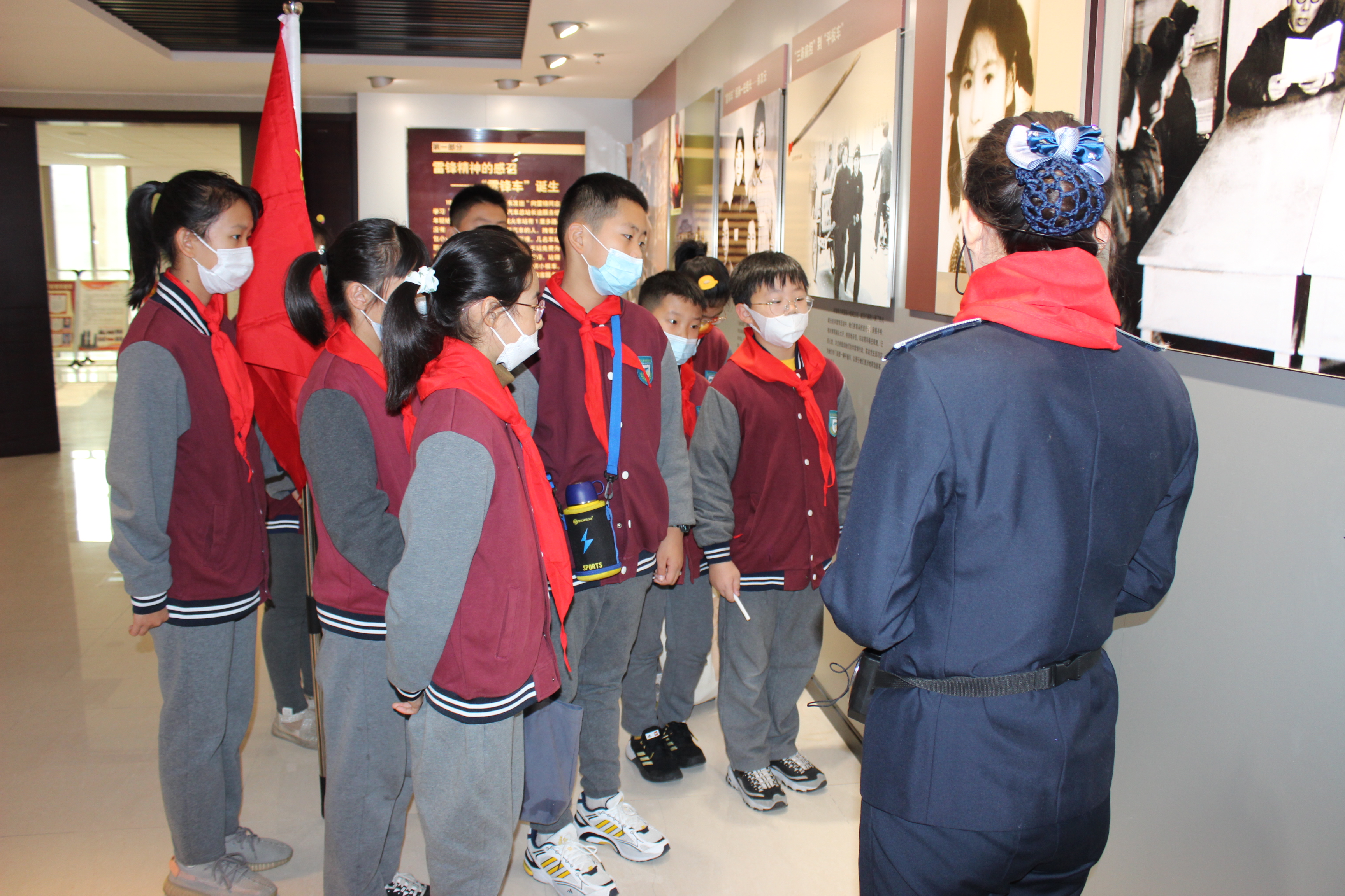 同学们跟随着少先队队旗,走进“雷锋车”事迹陈列馆,为讲解员李园园佩戴红领巾。他们跟随讲解员的脚步,认真聆听雷锋车手的感人事迹,观看图片、历史实物,了解雷锋车的更迭发展。当讲解员说到起初“雷锋车”手们使用的平板车时,同学们格外好奇,他们中的大部分从未见过平板车,纷纷凑到车前抚摸观察,感叹雷锋车手的艰辛,喊起了“向‘雷锋车’手阿姨学习”的响亮口号。